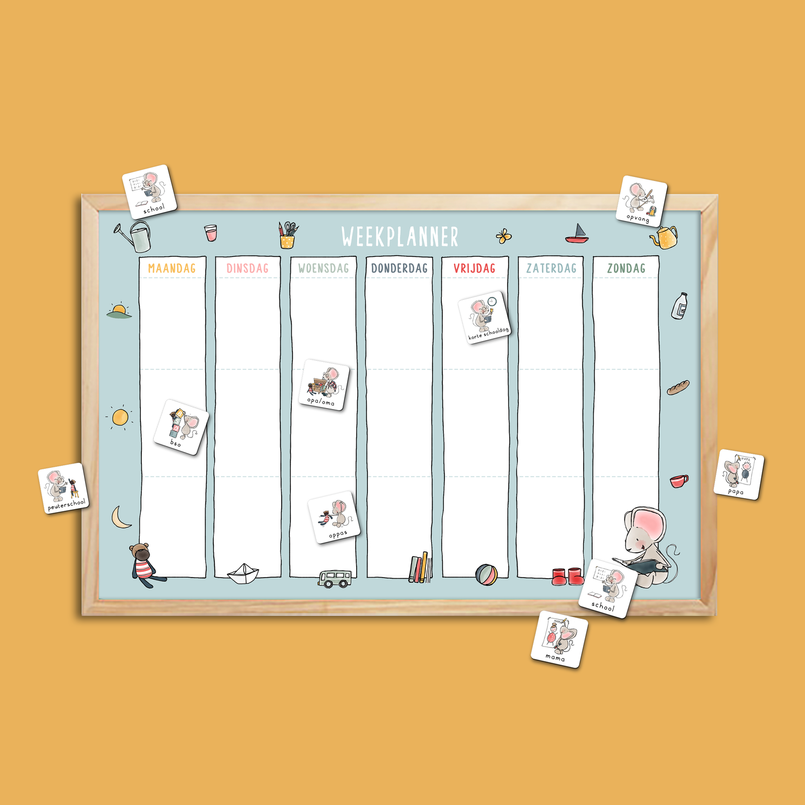 In dit vernieuwde basispakket zitten het magnetische planbord met houten rand en 2 sets met magneten: ‘school & opvang’ en ‘activiteiten basis’. Deze nieuwe versie van de weekplanner is tevens geschikt om op te schrijven met whiteboardmarker. Ook hebben de dagen verschillende kleuren en icoontjes en zijn de dagen onderverdeeld in ochtend, middag, avond. In totaal zitten er in deze set 40 magneetjes.